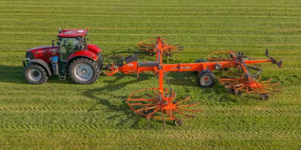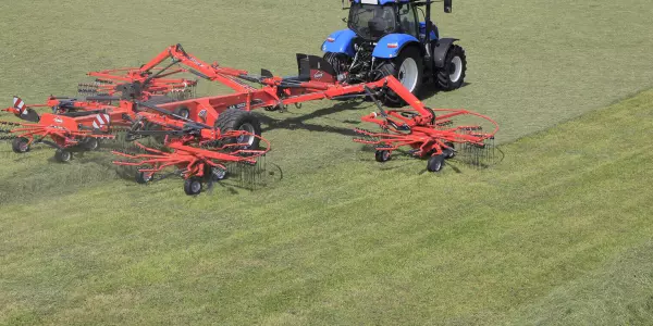 GA 13031 quad-rotor rake delivers central swaths. It works between 8.40 m and 12.50 m and features a 100% hydraulic drive system which saves one hour of maintenance per day.