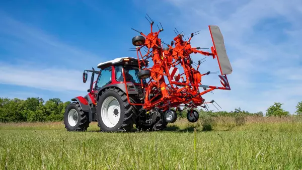 The new GF 8700 tedder, with its 8.70 m working width complements the current GF 8703. Its design offers an excellent ratio between mounted machine compactness and significant working width while remaining adapted to small tractors.