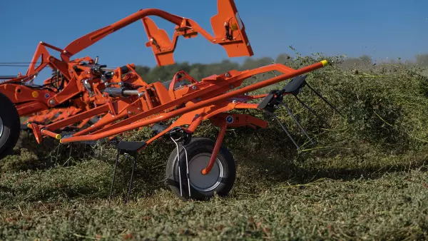 The rotor design and more rigid baseplate greatly reduce vibrations. The press-forming of the baseplate and arm have been reinforced. Tine deflectors eliminate the load on the tine arms, and prevent forage from riding up and winding round the rotor tines. The « anti-loss » function prevents losing tines in the forage which could damage the machines that follow and pollute the ration.The new OPTITEDD rotor pushes the limits in terms of resistance and lifetime of the working parts. It allows you to double the surface area you can ted. The design of the rotor, the arms and the tines means increased robustness so that the machine can work even in the most extreme conditions (heavy forage, stony ground, etc.).
