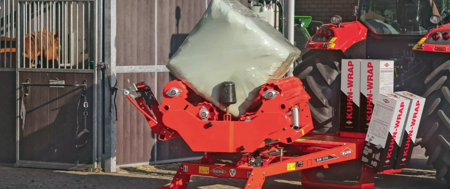 The KUHN square bale turntable wrappers are equipped with two pairs of steel rollers, with a ribbed profile. This design creates a deep and stable cradle for the bale, ensuring maximum bale traction, even bale rotation and proper film overlap, whatever the bale size. Two large bale support rollers provide additional stability and guidance. Round bales can also be wrapped with these wrappers.