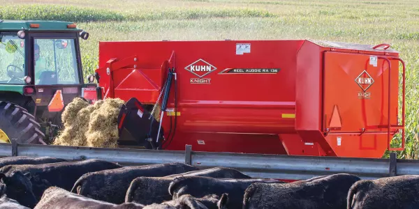 KUHN 3100 Series Reel Auggie mixers offer the same quality mixing performance and dependable service that has been their hallmark. The time tested, standard reel and auger design provides a fast, thorough mix for a fluffy, palatable ration.