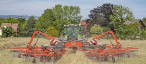 - The suspension of the front rotors, now carried out via hydraulic cylinders allowing a more precise adjustment of the latter. In addition, automatic ground pressure adjustment is possible depending on the working width. The user can easily adapt the machine to the working conditions. Plant cover and forage are thus preserved.