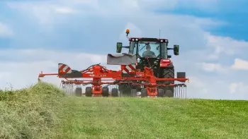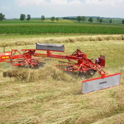 Para trabajar con forrajes muy densos o realizar hileras por la noche, el modelo GA 6002 puede configurarse para descargar dos hileras en cada pasada.