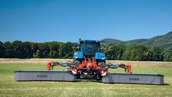 Con el sistema de suspensión oleoneumática LIFT-CONTROL, controlar las impurezas ya no es un problema. Es mucho más que un sistema de suspensión con un acumulador de nitrógeno, que sustituye al tradicional muelle. La cinemática exclusiva de las segadoras triples de KUHN integra un cilindro destinado a la suspensión del grupo de siega (1), un cilindro de activación de la seguridad (2), un acumulador de presión regulable (3) y un punto de giro estratégicamente situado cerca del centro de la máquina (4).