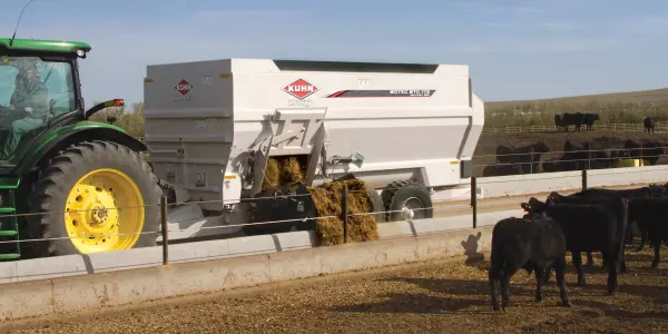 Las nuevas cajas de descarga KUHN ProFeed PF 100 son una opción eficiente para muchas granjas, corrales de engorde y ranchos grandes y extra grandes para alimentar más ganado por carga. Hay dos modelos disponibles con capacidades que van desde 1,000 a 1,450 pies3