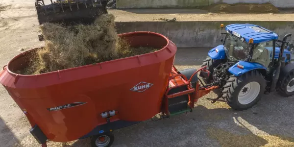 Remolque mezclador PROFILE PLUS 2 CL con 2 sinfines verticales con turbina de empajado, distribución transversal y diseñado con una caja ancha. Disponible con un volumen entre 24 y 34 m3, está pensado para rebaños de 120 a 265 vacas lecheras.