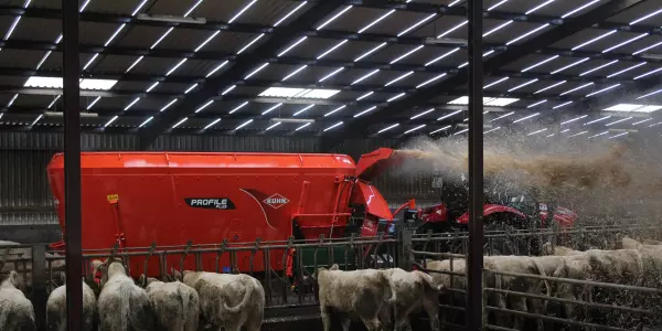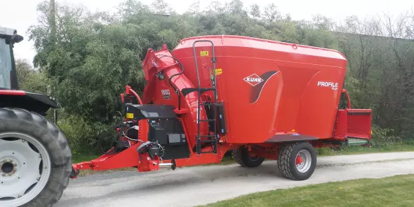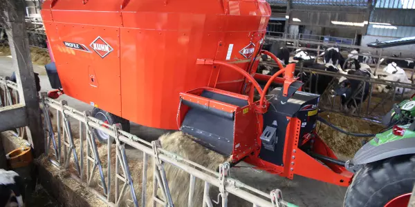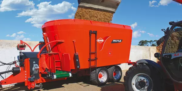 Remolque mezclador PROFILE PLUS 2 CS con 2 sinfines verticales con turbina de empajado, distribución transversal y caja estrecha. Disponible en 15 y 20 m3, este remolque mezclador está pensado para rebaños de 75 a 150 vacas lecheras.