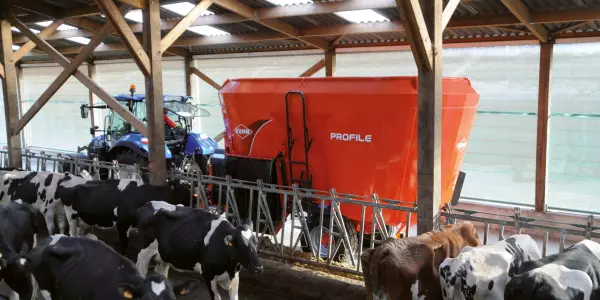 Remolque mezclador PROFILE 2 DS con 2 sinfines verticales con distribución lateral y diseñado con una caja estrecha. Disponible en 12 y 20 m3, está pensado para rebaños de 60 a 150 vacas lecheras.