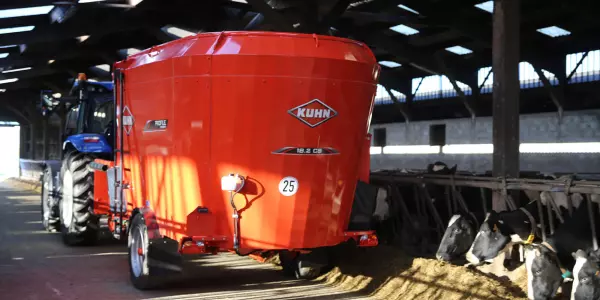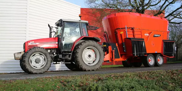 Remolque mezclador PROFILE 2 CS con 2 sinfines verticales con distribución transversal y diseñado con una caja estrecha. Disponible en 14 y 20 m3, este remolque mezclador está pensado para rebaños de 70 a 150 vacas lecheras.