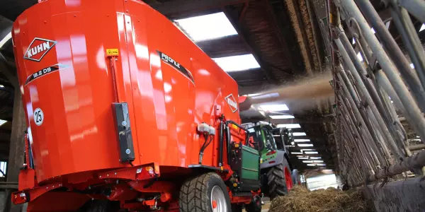 Remolque mezclador PROFILE PLUS 2 DL con 2 sinfines verticales con turbina de empajado, distribución lateral y caja estrecha. Disponible en 15 y 20 m3, este remolque mezclador está pensado para rebaños de 75 a 150 vacas lecheras.