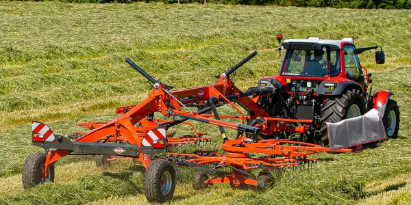 L'andaineur double rotors GA 6002, à dépose latérale, andaine sur une largeur de 3,50 m à 5,80 m en un ou deux andains. Utilisez cette machine avec un tracteur de faible ou moyenne puissance sans problème.