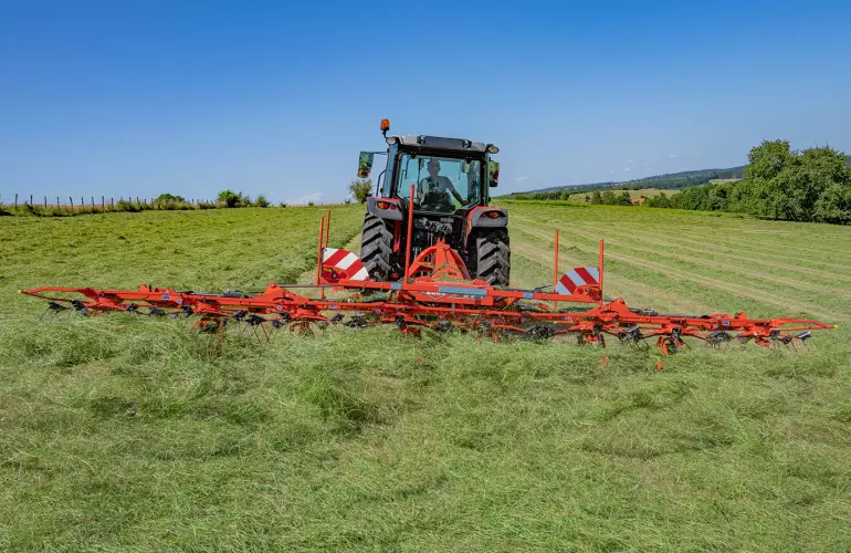 Disponibles en six largeurs de travail (5,20 m à 10,80 m), la gamme de faneurs portés GF 1003 saura répondre aux besoins de toutes les exploitations. Profitez de faneurs fiables et compacts, faciles à utiliser et manoeuvrer.