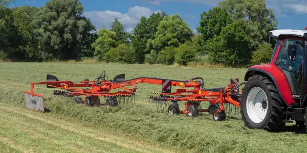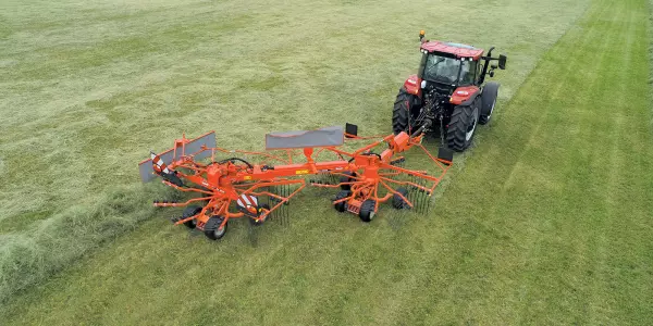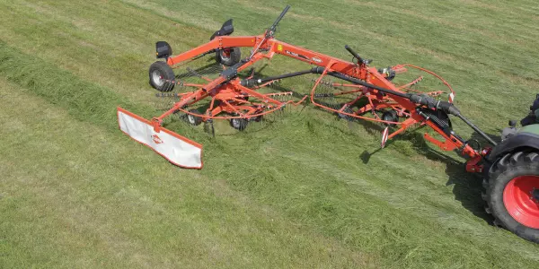 GA 6002 dubbele rotor-cirkelharken hebben een zijafleg. Het gras wordt over een breedte van 3,50 m tot 5,80 m in één of twee zwaden geharkt. U kunt deze machine zonder probleem gebruiken bij een trekker met een laag of middelhoog vermogen.